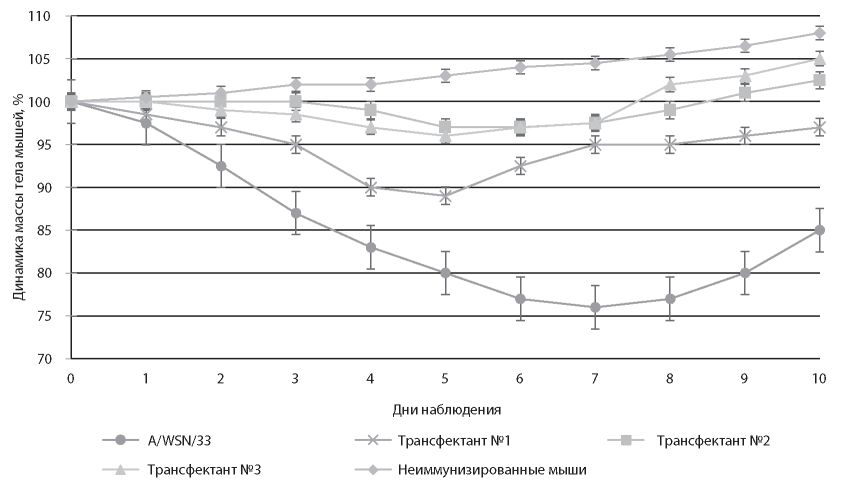 Изучение весовых характеристик мышей, инфицированных интраназально вариантами штамма А/WSN/SS вируса гриппа, содержащими сайт-специфические мутации в гене РВ1. Как показано на рисунке, у мышей, инфицированных интраназально вариантами штамма А/WSN/33, содержащими в гене РВ1 сайт-специфические мутации, унаследованные от различных ХА штаммов доноров аттенуации, наблюдались различные темпы снижения массы тела. У мышей, инфицированных исходным вирулентным штаммом А/WSN/33, отмечено быстрое и значительное снижение массы тела (20-25%) к 6-му или 7-му дню с момента заражения. Масса тела мышей, инфицированных трансфектантом, имевшем в РВ1-гене 3 мутации из РВ1-гена ХА штамма А/Энн Арбор/6/60 (K391E, E581G,Е457D), не снижалась столь значительно. Наблюдалось снижение массы тела в пределах 10-12%. Этот факт свидетельствует о том, что наличие трёх мутаций из пяти, формирующих ts-фенотип ХА штамма А/ Энн Арбор/6/60 в геноме вирулентного штамма А/WSN/33, значительно снижает его вирулентный потенциал. Трансфектанты, имеющие в РВ1-гене единичные мутации из РВ1-гена ХА штамма А/Энн Арбор/6/60, по динамике снижения массы тела занимали среднее положение между трансфектантом с тремя мутациями из ХА штамма А/ Анн Арбор/6/60 и исходным вирулентным штаммом А/WSN/33. Интересно отметить, что у мышей, инфицированных трансфектантом, имеющим в РВ1-гене только одну мутацию Ile147Thr из РВ1-гена ХА штамма А/Краснодар/101/35/59 (ffiN2), отмечено наименьшее снижение массы тела на протяжении всего срока наблюдения: не более 3-5% на 7-8-е сутки. Минимальное снижение массы тела наблюдалось и у мышей, инфицированных трансфектантом, содержащем в геноме две ts-мутации из РВ1-гена ХА штамма А/Ленинград/134/17/59 (K265N, V591I). Как видно из наших данных, интенсивность уменьшения массы тела у животных не коррелировала с количеством мутаций, включённых в геном вирулентного штамма.