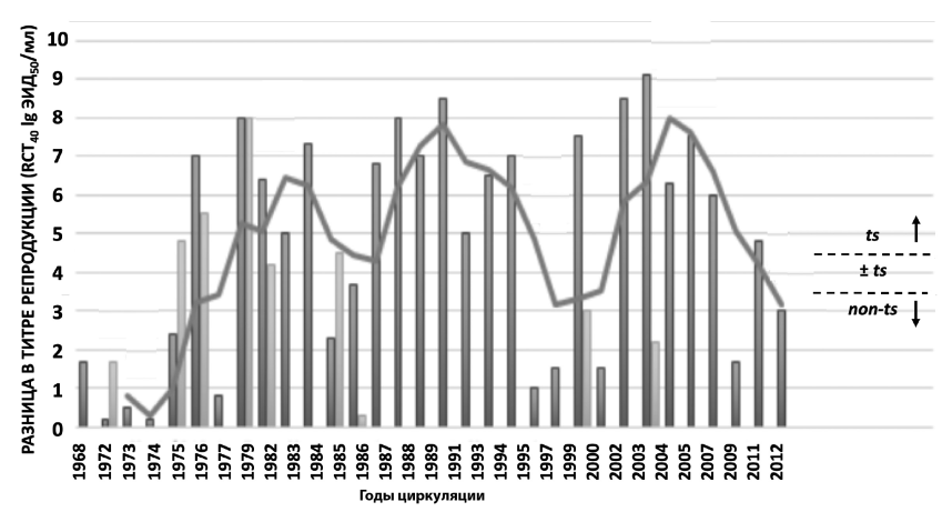 Пропорция ts-вирусов неуклонно возрастала с годами наблюдения. Так, в 1949-1957 гг. ts-вирусы составляли 8,3% всех исследованных изолятов сероподтипа A(H1N1), тогда как в 1979-1980 гг. 82,4% популяции вирусов H3N2 характеризовалось температурочувствительностью [14].