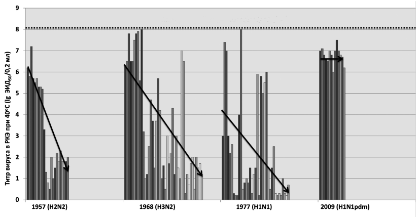 Рис. 3. Эволюция вирусов гриппа А разных пандемических циклов по признаку чувствительности к повышению температуры репродукции.Стрелка демонстрирует тенденцию к изменению фенотипа вирусов по признаку температурочувствительности.