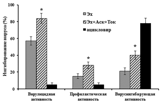 Рис. 1. Противовирусное действие препаратов на различных стадиях репликационного цикла ВПГ-2. * статистически значимые различия между действием гистохрома (Эх) и композицией антиоксидантов (Эх + Аск + Ток) (p ≤ 0,05).