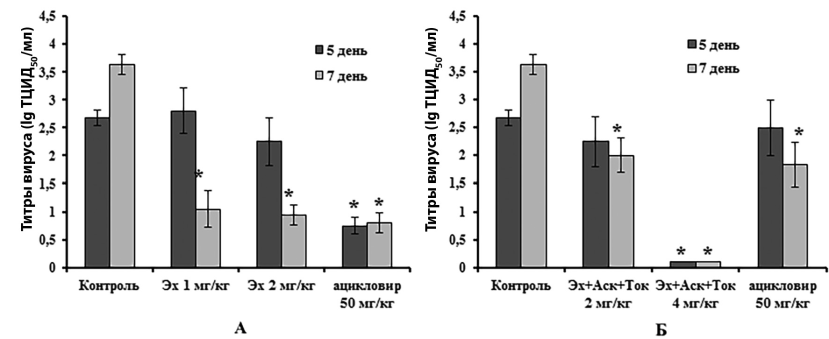 Рис. 2. Влияние препаратов на динамику изменений титров вируса в вагинальных смывах мышей, инфицированных ВПГ-2. А внутрибрюшинное введение гистохрома (Эх) и ацикловира; Б пероральное введение композиции антиоксидантов (Эх + Аск + Ток) и ацикловира; * статистически значимые различия между показателями опытной и контрольной (+) групп (p < 0,05). Контроль инфицированные животные, не получавшие лечения.