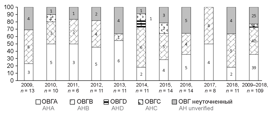The study of the dynamics of the etiological structure of AVH for the analyzed period showed that hepatitis A was the cause of death in 45-54% of patients from 2010 to 2013. In 2014, the proportion of deaths from AHA decreased to 18%, but in subsequent years there was an increase in lethality, and in 2017 it reached the previous level again (50%). As for AHB infection, in 2009, 2014, 2017-2018, it was the cause of death of every second patient, and in the periods 2010-2012 and 2015-2016 every third patient who died. Hepatitis C virus as the cause of death in 4 patients with AVH was established in 2010, 2014, and 2015. The proportion of unsverified hepatitis among patients with unfavorable outcome reached 30% in 2009, n = 13, 2013, n = 11, 2016, n = 14, and 2018, n = 11.