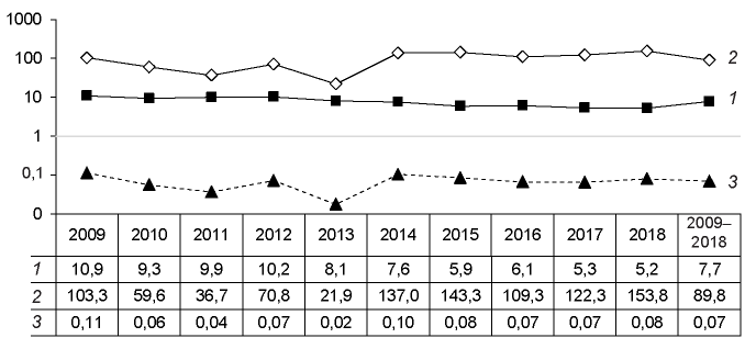 The average cumulative incidence over the observed 10 years was 7.7⁰/0000, with a progressive 2.1-time decrease (by 52.3%) over the study period (10.9 and 5.2⁰/0000, 2009 and 2018, respectively). At the same time, during the first five years of the analyzed period, the lethality rate decreased 4.7 times (by 78.8%) (103.3 and 21.9⁰/000, 2009 and 2013, respectively), and since 2014, there has been a sharp rise in lethality – 6.2 times (21.9 and 137.0⁰/000, 2013 and 2014, respectively). This trend continued in the subsequent years: 137.0 and 153.8⁰/000, 2014 and 2018, respectively. The average cumulative indicator was 89.8⁰/000. The mortality rate decreased similarly to lethality during the first five year of the period under study (0.11 and 0.02⁰/0000, 2009 and 2013, respectively) and increased 5 times in 2014 (0.02 and 0.10⁰/0000, 2013 and 2014, respectively). In the period 2014−2018, despite the increasing trend in the lethality rate, the mortality rate remained stable at the level of 0.07−0.08⁰/0000.