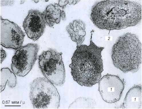 Fig. 1. Yersinia pseudotuberculosis, a periodic culture in nutrient broth at a temperature of 18-20°C, 40 days, the stationary phase — the die-phase. Transmission electron microscopy (photo by L.M. Somova). 1 — lysed bacteria; 2 — chromatin fibrils in the nucleoid zone.