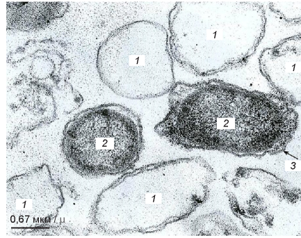 Fig. 2. Yersinia pseudotuberculosis, a periodic culture in phosphate-buffered saline at a temperature of 18-20°C, 15 days, the stationary phase — die-phase. Transmission electron microscopy (photo by L.M. Somova). 1 — lysed bacteria with empty cytosol; 2 — bacteria with dense cytosol; 3 — cell wall.