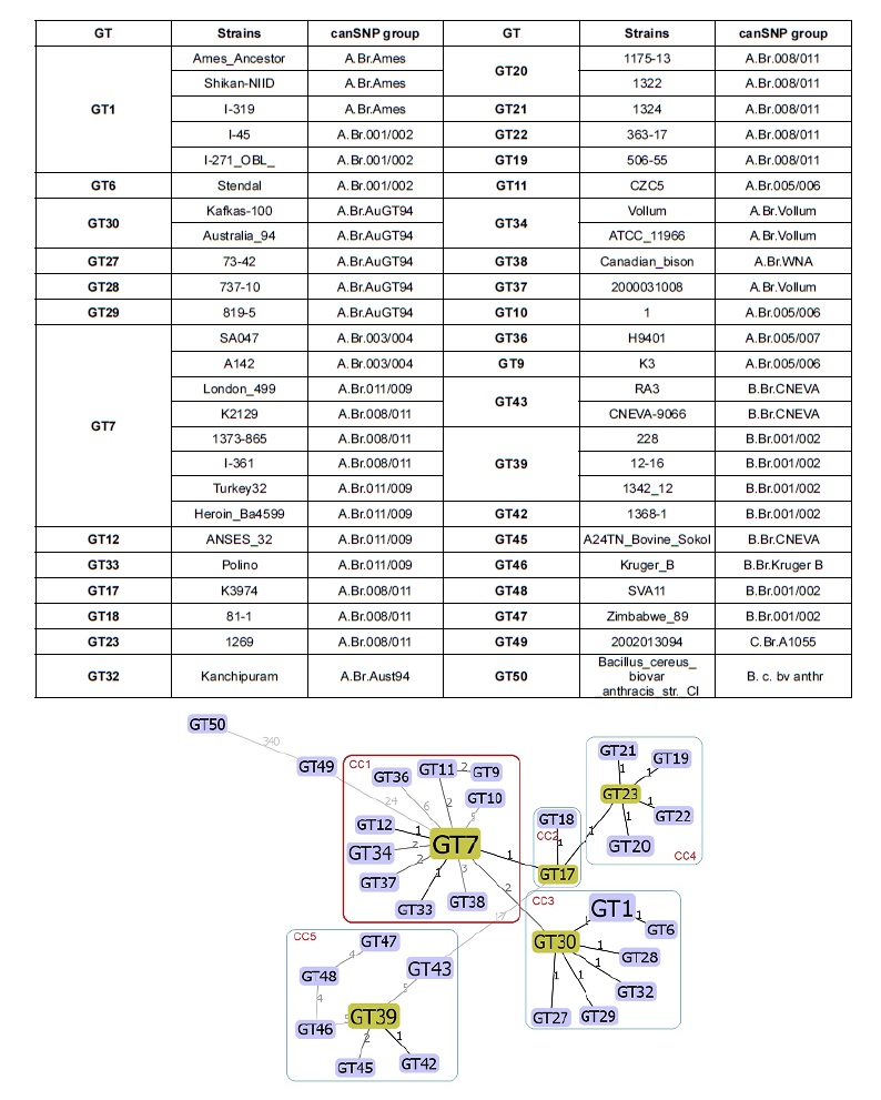 CC1 includes GTs of 18 strains of 7 groups out of 14 canSNP groups from major genetic B. anthracis lineage A. CC2 consists of 2 GTs of the A.Br.008/011 group and serves as an intermediate link between CC1, CC4 having strains of lineage A and CC5having strains of lineage B. CC3 includes 7 GTs from A.Br.Aust94, A.Br.001/002 and A.Br.Ames groups. CC4 consists of 5 GTs of the A.Br.008/011 group of major lineage A. CC5 includes 7 GTs of 10 strains from all canSNP groups of major B. anthracis lineage B.