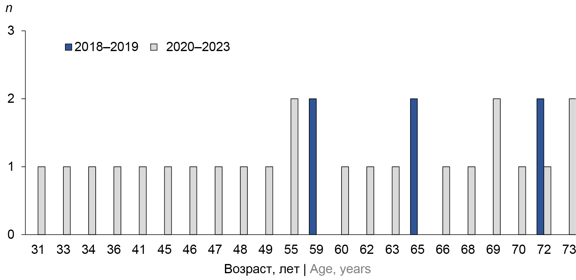 The minimum age of patients in this cohort decreased to 31 years (Fig. 1). The proportion of patients under 59 years of age was 34%. At the same time, the proportion of deaths in the study group increased 1.57-fold (from 36% before the pandemic to 57% during the COVID-19 pandemic).