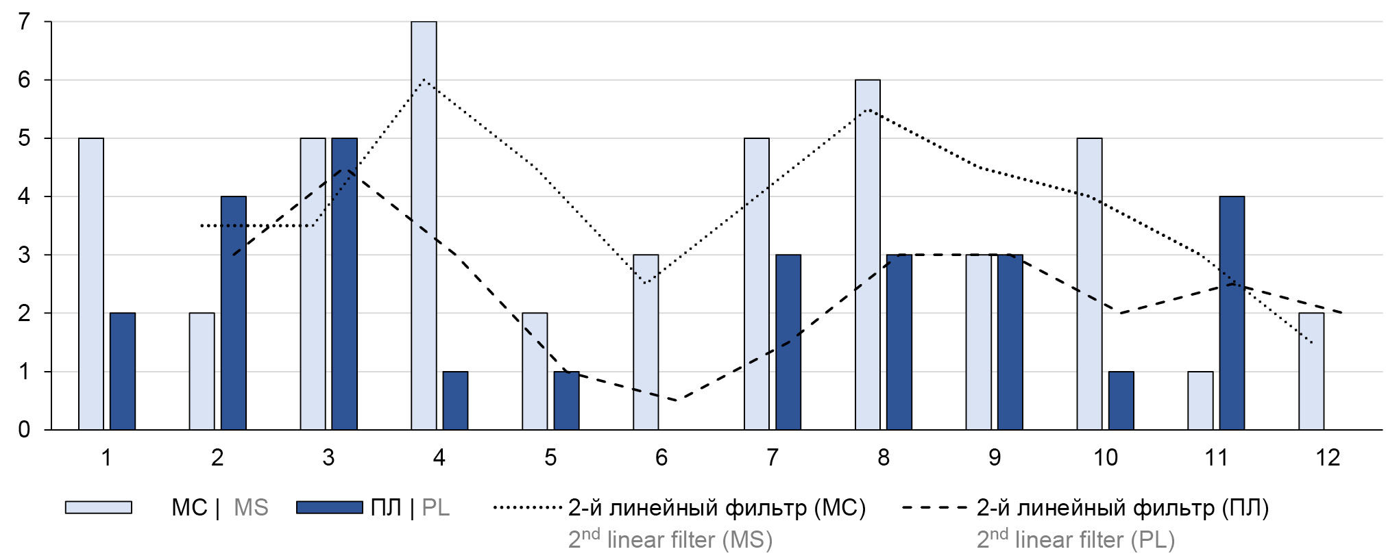 Fig. 2. Distribution of detected IL cases by months. MS — meningitis-septicemia; PL — perinatal listeriosis.