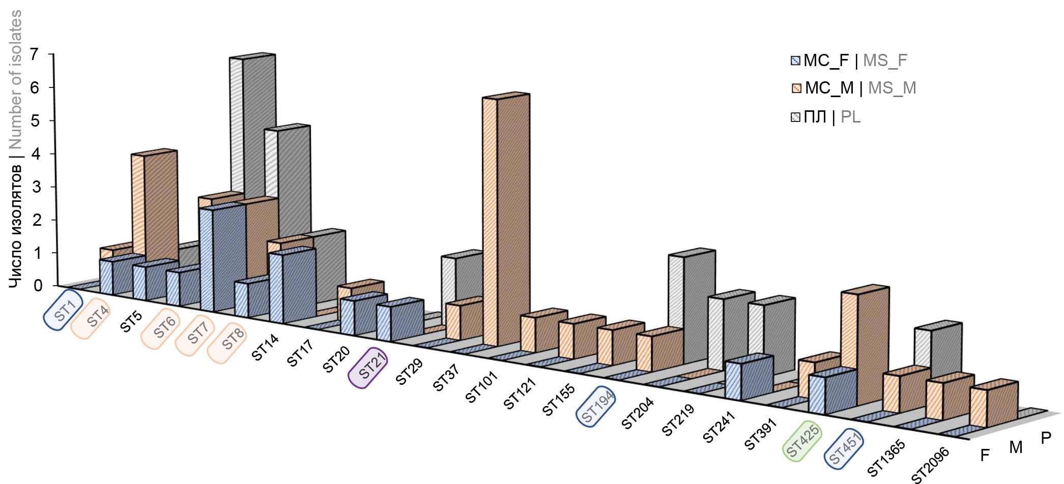 Generally, the number of genotypes matching those in the group of food isolates was higher in the MS_M group: there were 6 matching genotypes (ST7, ST8, ST37, ST121, ST155, ST451), while PL and MS_F groups had only 2–3 genotypes matching genotypes of food isolates.