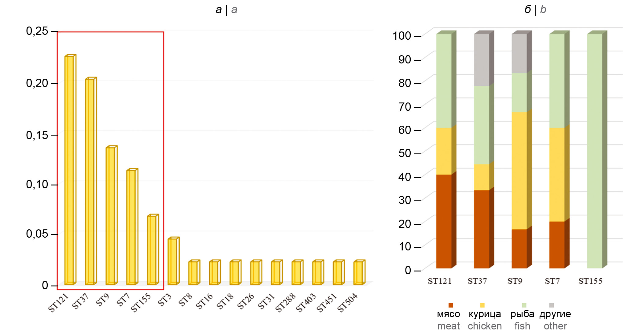 Fig. 5. L. monocytogenes isolates from food product. а — the frequency of occurrence of different L. monocytogenes genotypes in products; b — distribution of the most represented L. monocytogenes genotypes by product categories. The red frame shows the most represented L. monocytogenes genotypes.