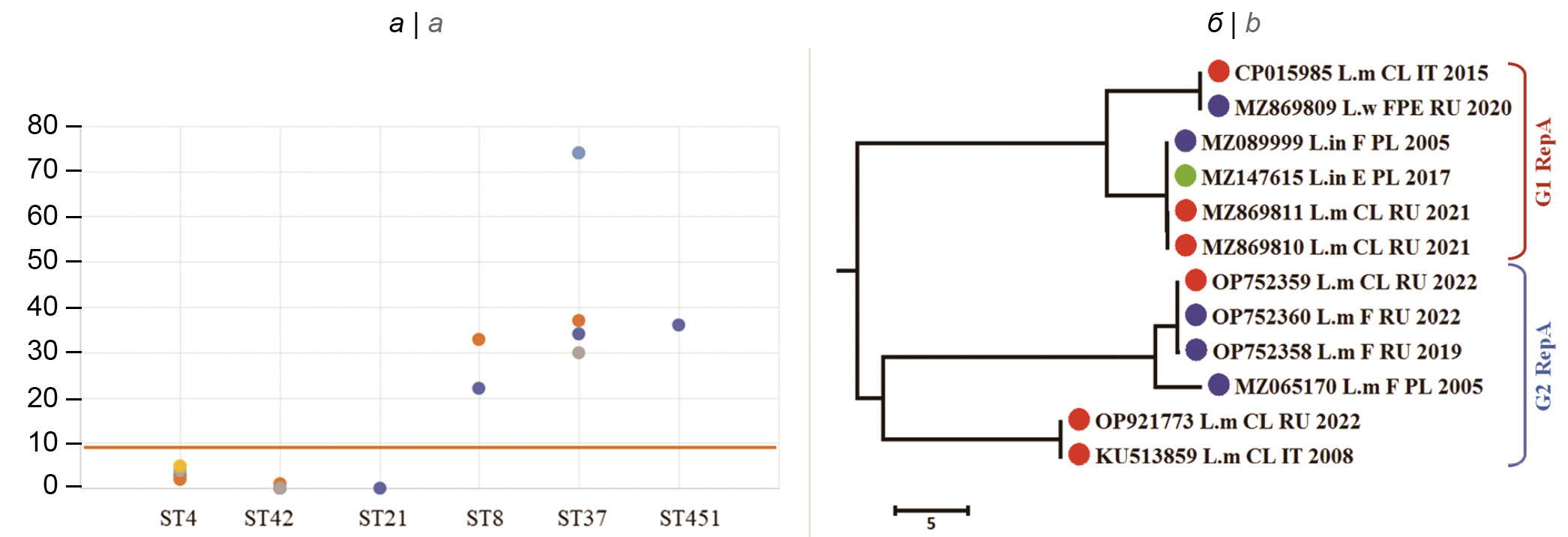 Fig. 6. Genomic characteristics of L. monocytogenes isolates. a — the number of loci differentiating core genomes of the same genotype; b — plasmidome of the isolate subset. The orange line indicates the permissible number of differences (7–10), based on which isolates can be assigned to the same epidemic outbreak. The Listeria species indicated on the phylogenetic tree: L.m — L. monocytogenes, L.w — L. welshimeri. Countries of origin of isolates: IT — Italy; PL — Poland; RU — Russia. Sources of isolates: F — food; E — environment; FPE — food production environment; CL — clinical isolates. Colored circles: red — clinical isolates; blue — food isolates; green — isolates from the environment.