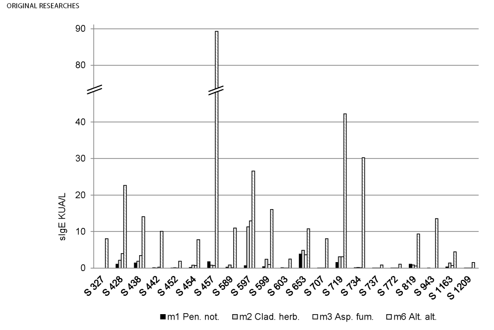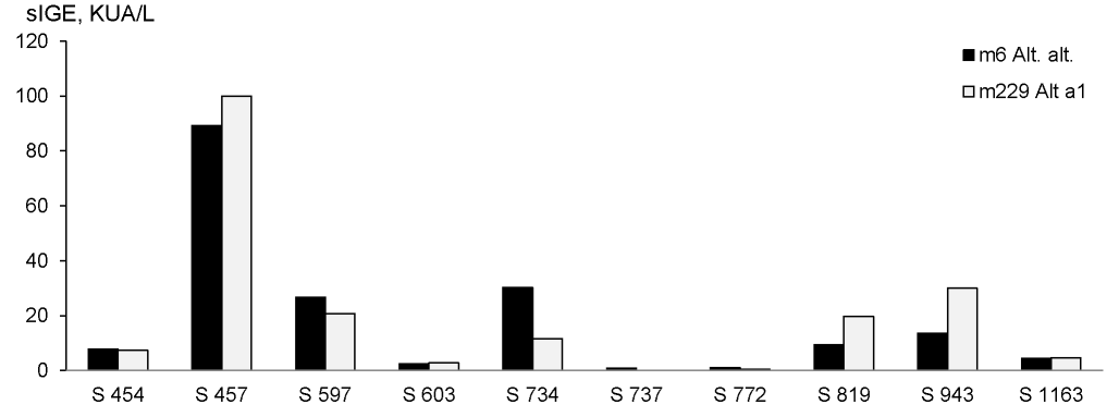 Results. All studied patients (100%) had elevated sIgE to Alternaria alternata. Eight (38%) patients were sensitized to Penicillium notatum. 11 (52%) and 10 (48%) patients were sensitized to Cladosporium herbarum and to Aspergillus fumigatus, respectively. Ten patients (48%) were monosensitized to Alternaria alternata. Nine (90%) patients with sensitization to Alternaria alternata demonstrated elevated levels of IgE to Alt a1.