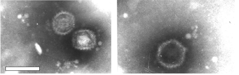 To confirm the VZV presence in the study material we analyzed the vFiraVax VZV strain VCF concentrate with an electron microscope. The negative staining technique detected only nucleocapsids of the CA vFiraVax VZV strain at the 20th passage level (Fig. 1). For reasons not yet understood, virions of extracellular VZV VCF have not been detected by electron microscopy [12].