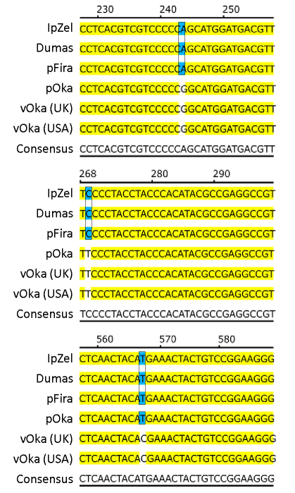 The virus identity was also confirmed by using partial sequencing of isolated plasmid DNA fragments encoding orf 0 of pFira VZV and lpZel HZ strains on the 8th passage. The genome section equal to 580 nucleotide sequences of DNA of VZV variants partially attenuated at a lower temperature was compared with the European strain Dumas and with Japanese pOka VZV and vOka VZV strains (Fig. 2).