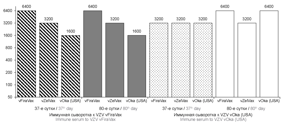 The immune serum for the CA vFiraVax VZV virus strain, which was obtained on the 37th and 80th days after the immunization of guinea pigs, equally efficiently neutralized all the three VZV strains (Fig. 4): The highest neutralizing activity was demonstrated with the homologous strain, while the lowest activity was observed with the vOka VZV (USA) vaccine strain. The immune serum for the vOka VZV (USA) vaccine strain, which was obtained on the 37th day after the immunization of guinea pigs, equally efficiently neutralized all the three VZV strains, including the homologous vOka VZV (USA) vaccine strain.