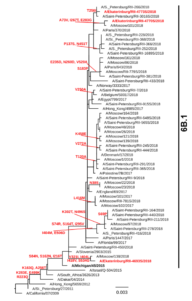 По данным Национального центра по гриппу ВОЗ при ФГБУ «НИИ гриппа им. А.А. Смородинцева» Минздрава России, антигенный и генетический анализ вирусов гриппа A(H1N1)pdm09 и A(H3N2), циркулировавших в сезон 2017-2018 гг., показал, что все исследованные вирусы гриппа А по структуре поверхностных генов соответствовали штаммам, рекомендованным для включения в состав вакцин в сезон 2017-2018 гг. Вместе с тем во внутренних генах циркулирующих вирусов был обнаружен ряд замен, что соответствует данным, полученным в Екатеринбурге [7]. Ситуация по гриппу В была противоположной, поскольку в России доминировали вирусы гриппа В разновидности Ямагата, в то время как в вакцину был включен штамм В/Brisbane/60/2008 викторианской разновидности.