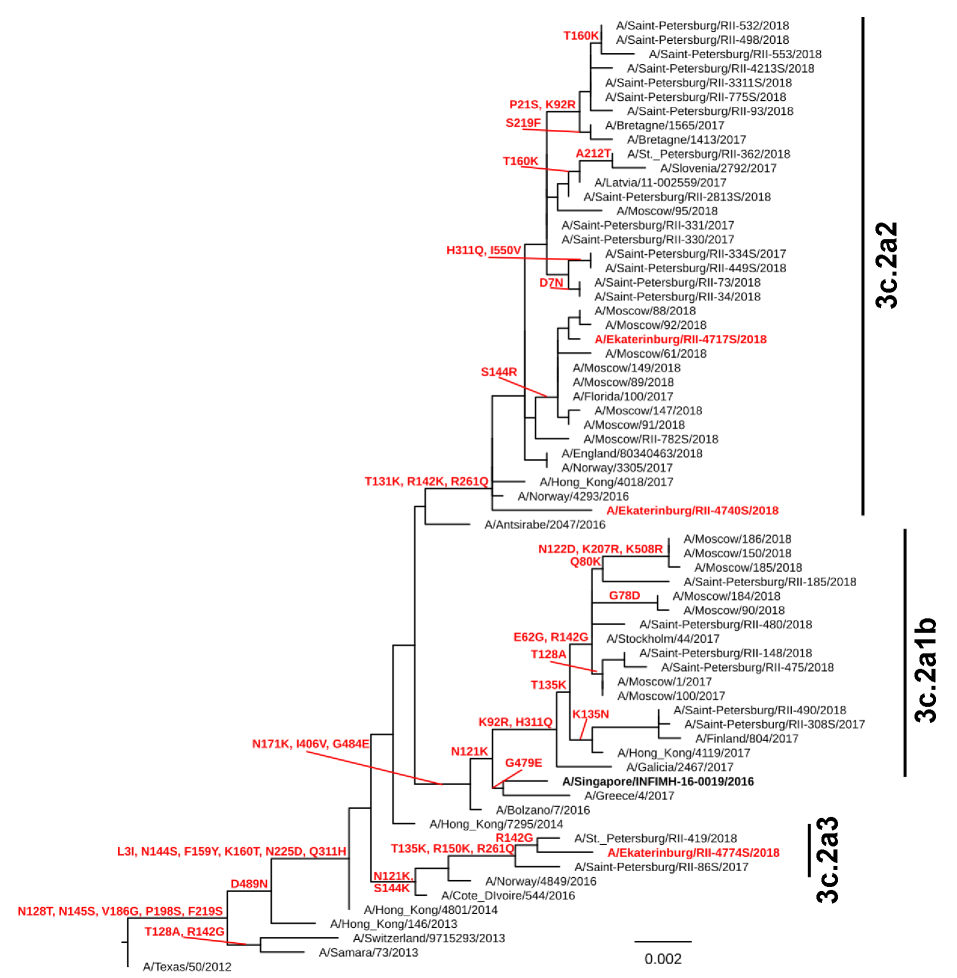 Вирусы гриппа A(H3N2), циркулировавшие в России в эпидемический сезон 2017-2018 гг. были представлены тремя генетическими клайдами: ЗС.2а1В, ЗС.2а2 и ЗС.2аЗ (рис. 2). Вирусы гриппа A(H3N2) из Екатеринбурга принадлежали к клайдам ЗС.2а2 (A/Ekaterinburg/RII-4717S/2018, A/Ekaterinburg/RII-4740S/2018) и ЗС.2аЗ (A/Ekaterinburg/ RII-4774S/2018). Представителей клайда ЗС.2а1В, подобных рекомендованному вакцинному штамму A/Singapore/INFIMH-16-0019/2016, среди вирусов из Екатеринбурга не выявлено. Вирус клайда 3C.2a3 из Екатеринбурга, помимо стандартных аминокислотных замен N121K и S144K в антигенном сайте A, содержал дополнительный набор замен: T135K (с потерей потенциального сайта гликозилирования), R150K и R261Q.