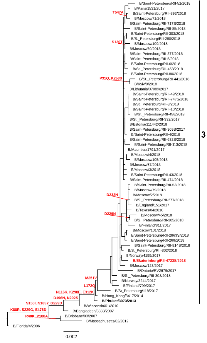 Исследованные вирусы гриппа В относились к линии Ямагата, клайду 3. Вирус гриппа В/Ekaterinburg/RII-472зS/2018 отличался от референс-штамма B/Phuket/3073/2013 двумя аминокислотными заменами в гене гемагглютинина M251V и L172Q (рис. 3).