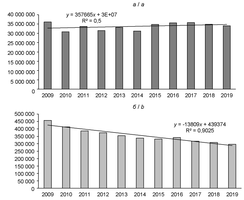 Dynamics of the absolute number of cases of infectious (a) and parasitic (b) diseases in Russia in 2009-2019.