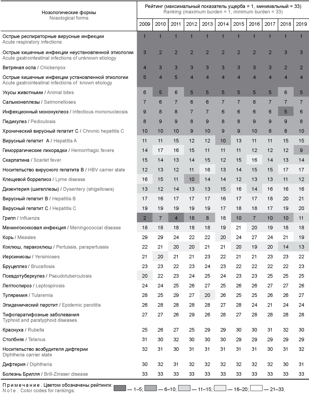 Table 2. Ranking dynamics of economic burden of infectious diseases (exclusive of tuberculosis and HIV infection) in Russia in 2009-2019