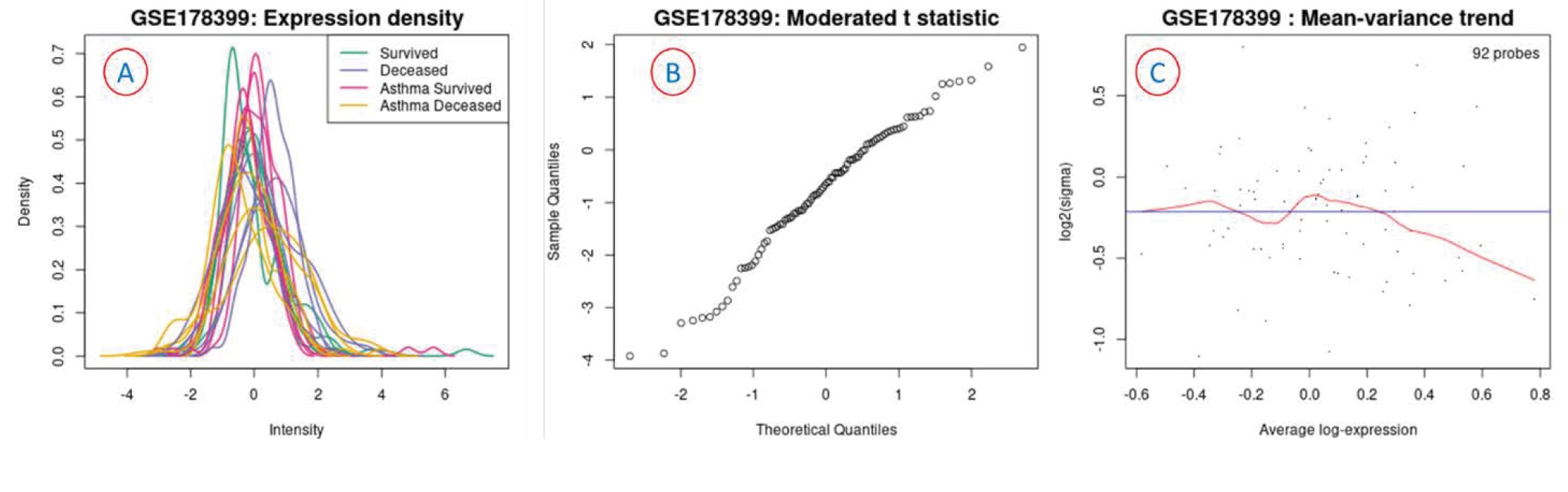 plotDensities was utilized to estimate the distribution values of the selected samples based on the colored group. This plot complements the boxplot for data normalization verification before differential expression analysis. There is no difference in the distribution of density curves in the current investigation. The plot depicts the data after log transformation and normalization have been completed, as seen in Fig. 2, a. The limma (qqt) plot compares the quantiles of the dataset to the theoretical quantiles of the t-test distribution. This plot aids in evaluating the quality of the limma test results. The dots in Fig. 2, b are optimally aligned along a straight line, indicating that the values for the moderated t-statistic derived from the test conform to their theoretically predicted distribution. After a linear model has been fitted, the Vooma plot is used to assess the mean-variance relationship of expression data. This graphic can assist determine whether it is worthwhile to use precision weights to account for the trend of mean-variance. Each black dot in the data represents a gene, and the red line is an approximation of the variance direction that can be taken into account during differential gene expression analysis. The blue line depicts the continuous variation shown in the illustration in Fig. 2, c.
