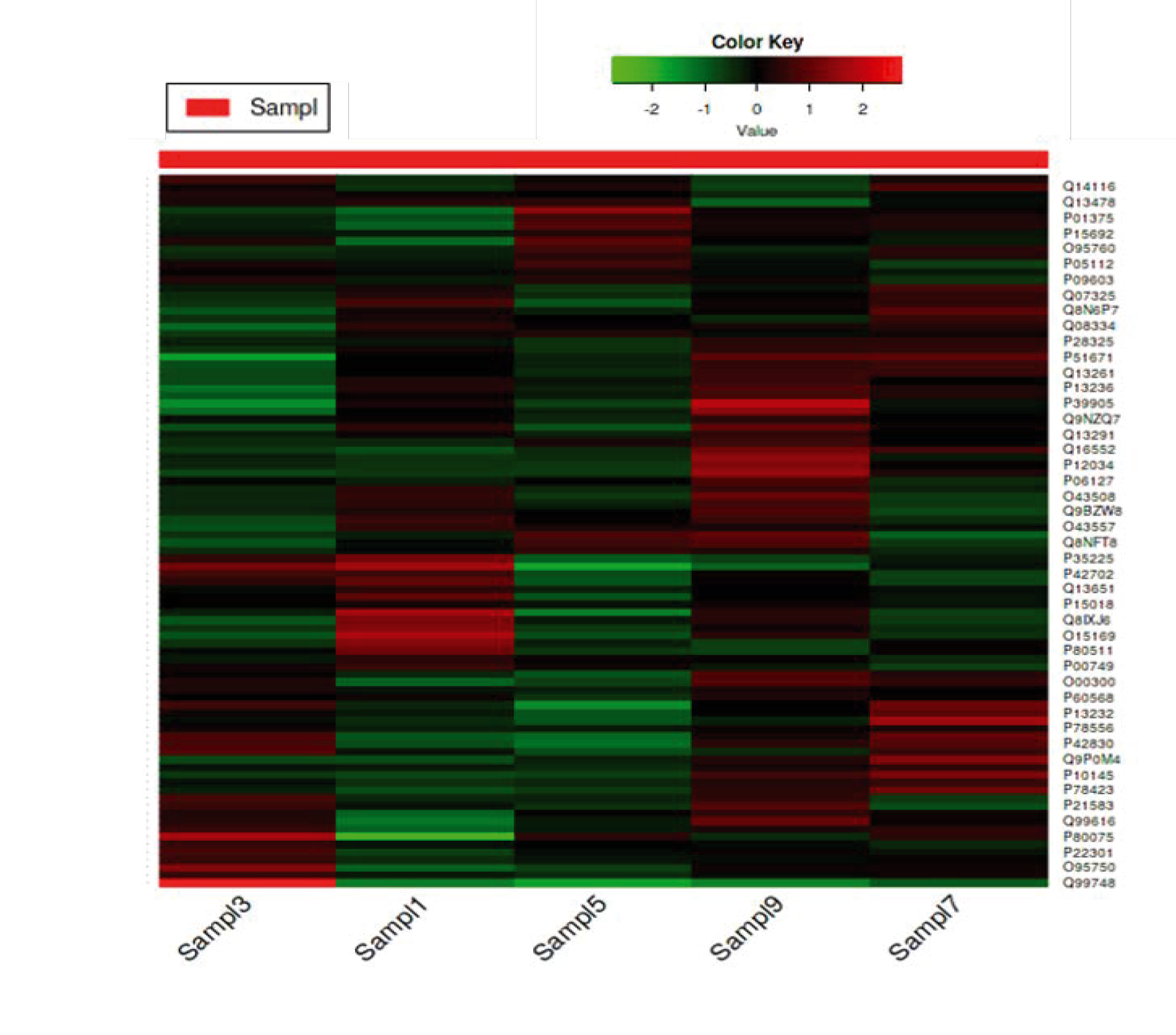 The heatmap of the expression genes for the selected samples is shown in Fig. 3. Changes in gene expression are shown by a scale ranging from –3 for down-regulation (green) to 3 for up-regulation (red).