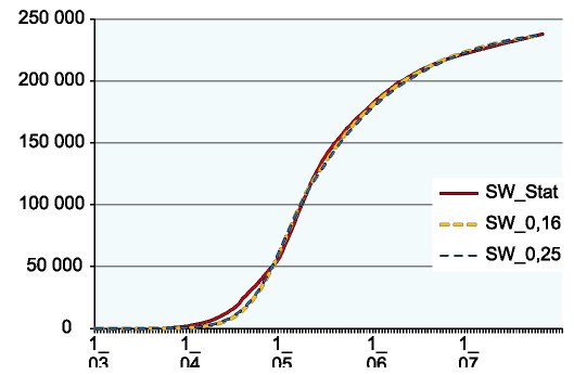 Fig. 1. The result of model verification is a comparison of models (SW_0,16; SW_0,25) and statistical data on cumulative morbidity (detected cases, SW_Stat).Here and in Figs. 2-9: the horizontal axis shows the dates; the vertical axis shows the number of cases.
