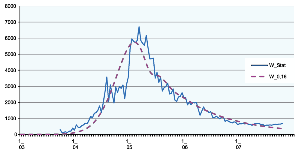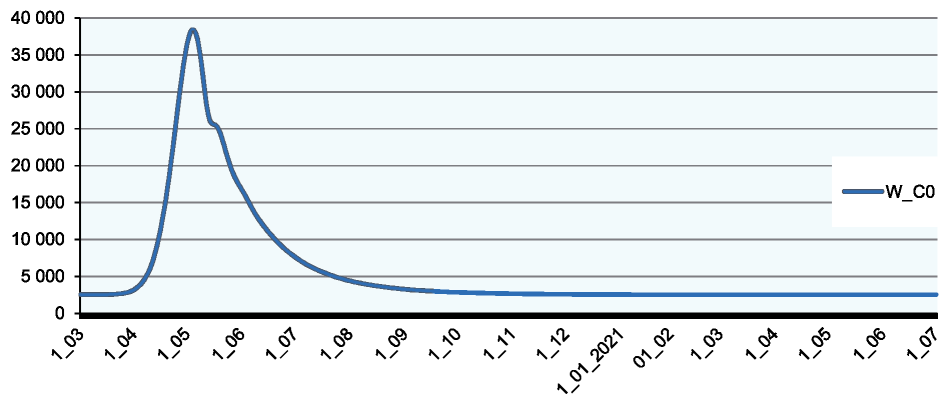 Fig. 6. Dynamics of the daily number of infected cases according to the C0 baseline scenario (W_C0).