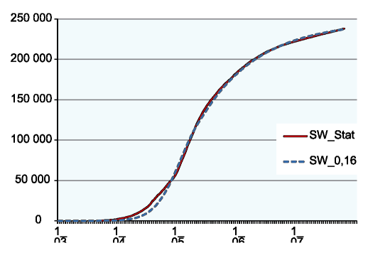 Fig. 3. Detected (reported) cases of cumulative incidence. Statistical data — SW_Stat, model — SW_0,16