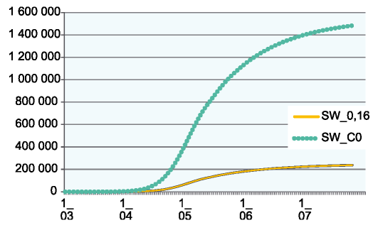 Fig. 4. Detected (reported cases) (SW_0,16) and «recovered» cumulative incidence in accordance with the selected baseline scenario C0 (SW_C0).