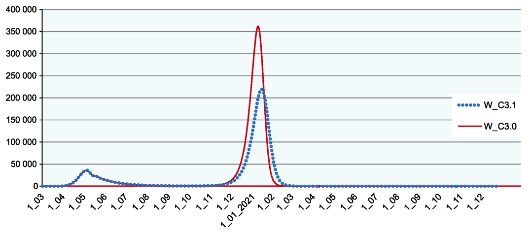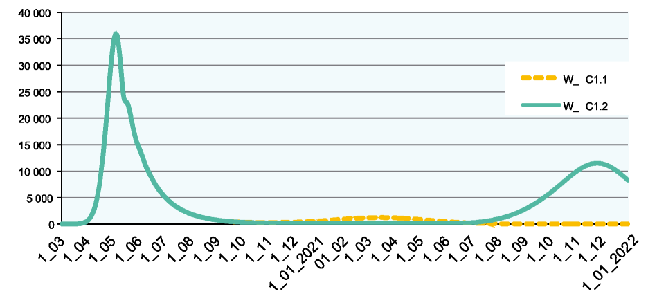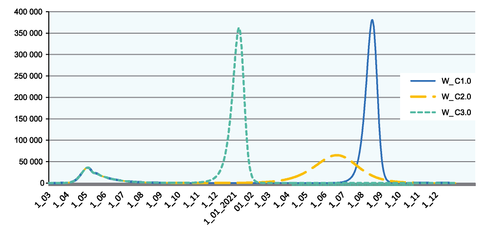 Scenario C1.0 illustrates the situation when there are only a few isolated cases of the disease (or no cases may be recorded by the end of February) and seasonal ARVI (acute respiratory viral infection) incidence goes down, the restrictive measures will be eliminated, for example, starting from March 2021, which means a significant reduction in EPMs. Under such conditions and in absence of vaccination, there is a high probability of a new surge in cases and an incidence peak (380,000) reached by mid-August 2021 (Fig. 7, W_C1.0).