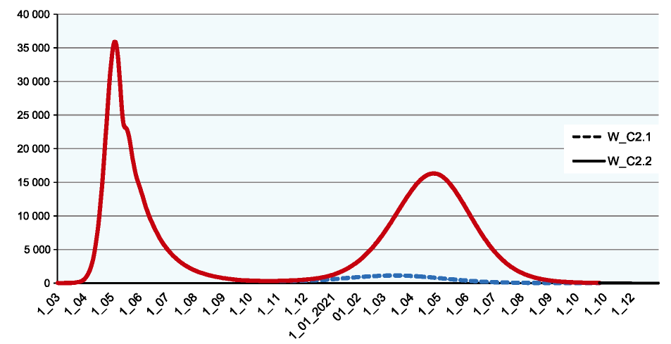 Scenario C2.2: A moderate reduction in EPMs from late September 2020 to January 2021 and the vaccination covering 300 thousand people by January 2021, 2 million people by early April and then 4.3 million by October 2021 will lead to a more significant increase in the daily incidence with a peak (18,302 people) at the end of April 2021. (Fig. 9, W_C2.2).