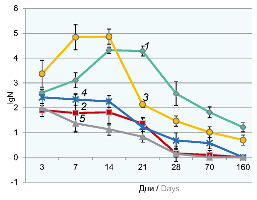 1 — the 1st vaccination with attenuated BP bacteria; 2 — the 1st vaccination with virulent BP bacteria; 3 — the infection with virulent BP bacteria 12 months after the vaccination with attenuated BP bacteria; 4 — the repeated vaccination with virulent BP bacteria; 5 — the repeated vaccination with attenuated BP bacteria.