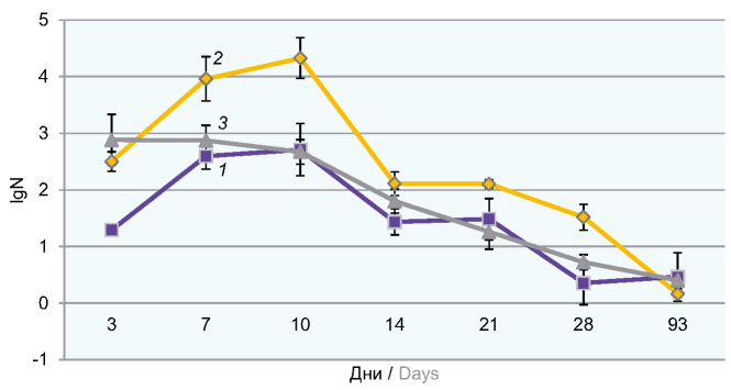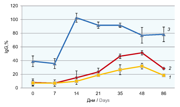 Fig. 4. Changes in the IgG relative levels in the RMs' blood serum after the 1st and repeated intranasal infection of the animals with Bp 18323 bacteria.1 — the 1st experimental intranasal infection at a dose of 107 CFU; 2 — the 1st experimental intranasal infection at a dose of 109 CFU; 3 — the repeated experimental infection with BP 18323 at a dose of 109 CFU.