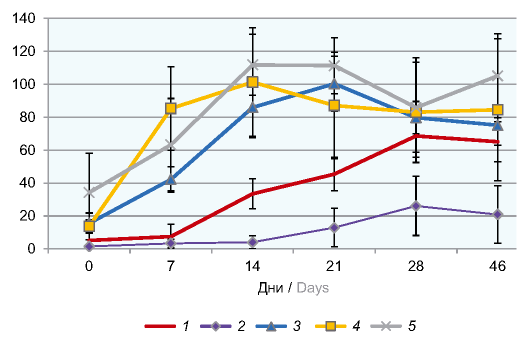 Fig. 3. Changes in the IgG level in the RMs' blood serum after the 1st and repeated intranasal vaccination with BP bacteria.On the vertical axis — the relative value of IgG levels (%): ODC+/ODi, where ODC+ — optical density of the positive control, ODi — optical density in the well with the studied serum. 1 — the 1st vaccination with attenuated BP bacteria; 2 — the 1st vaccination with virulent BP bacteria; 3 — the infection with virulent BP bacteria 12 months after the vaccination with attenuated BP bacteria; 4 — the repeated vaccination with virulent BP bacteria; 5 — the repeated vaccination with attenuated BP bacteria.