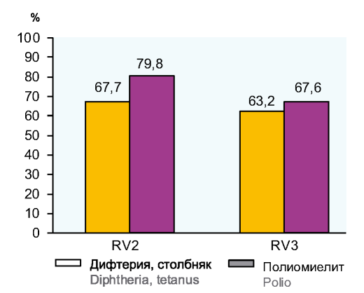 Полнота охвата последующими ревакцинациями против дифтерии и столбняка в декретированном возрасте составляла 63,2-67,7%, против полиомиелита — 67,6-79,8% (рисунок) при нормируемом показателе 95%.