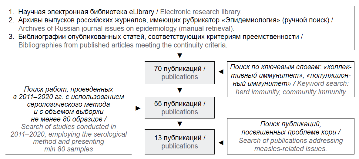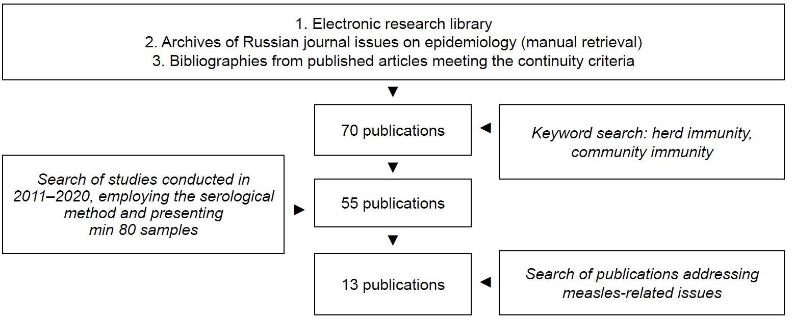 The systematic review included only Russian studies addressing assessment of measles-related HI of the Russian population and was performed in compliance with the protocol outlining the sequence of operations required for data collection (Figure).