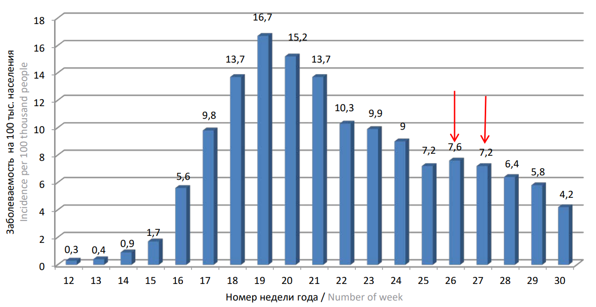 Рис. 1. Динамика заболеваемости COVID-19 жителей Республики Татарстан. Стрелками отмечена неделя проведения исследования серопревалентности (26.06–05.07.2020). Fig. 1. Dynamics of the incidence of COVID-19 in the population of the Republic of Tatarstan. The arrows show the period when the seroprevalence study was conducted (26.06–05.07.2020).
