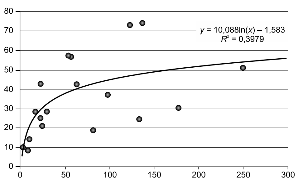 Результаты обследования населения Республики Татарстан показали достаточно высокую долю серопревалентных лиц среди населения — 31,3 ± 0,86%, что существенно выше, чем в Санкт-Петербурге (26,0 ± 0,8%) [7] или Ленинградской области (20,7 ± 0,7%) [12]. Как и в других регионах (Санкт-Петербург и Ленинградская область) [11][12], наиболее высокая серопревалентность была отмечена среди детей. В настоящее время не представляется возможным дать исчерпывающее объяснение данной особенности, можно лишь предположить, что определенное влияние на становление антительного коронавирусного пейзажа у детей оказывают перекрестные антитела, появляющиеся в результате ОРВИ, вызванных другими типами β-коронавирусов, имеющих общие детерминанты в нуклеокапсидных белках [9]. Среди других возрастных групп обращает на себя внимание достоверное снижение серопревалентности среди лиц в возрасте 70 лет и старше (24,0%) Можно предположить, что эта особенность в некоторой степени связана с меньшей мобильностью этой группы населения или с более строгим соблюдением режима изоляции. При анализе связи между серопревалентностью и заболеваемостью достоверной зависимости выявить не удалось, однако отмечена явная тенденция с коэффициентом корреляции 0,32. Регрессионный анализ показал, что эта тенденция описывается логарифмической зависимостью, описываемой с помощью уравнения: