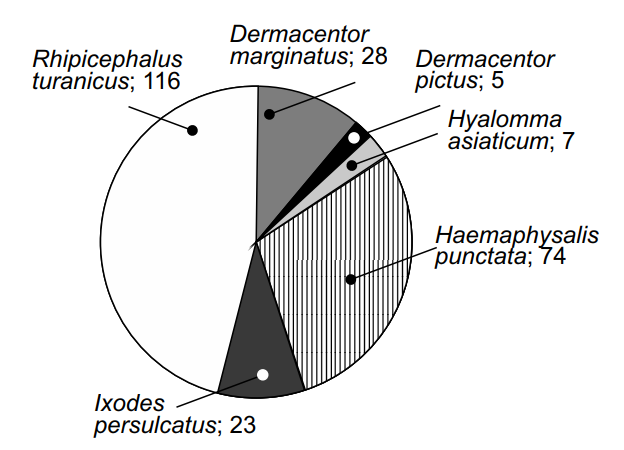 39,5–52,2%), Ha. punctata (74/253; 29,3%; 95% ДИ 23,7–35,3%) и D. marginatus (28/253; 11,1%; 95% ДИ 7,5–15,6%). Наименьшее количество напавших на людей клещей были идентифицированы как Hy. asiaticum (7/253; 2,7%; 95% ДИ 1,1–5,6%) и D. pictus (5/253, 1,9%; 95% ДИ 0,6–4,5%; рис. 1).