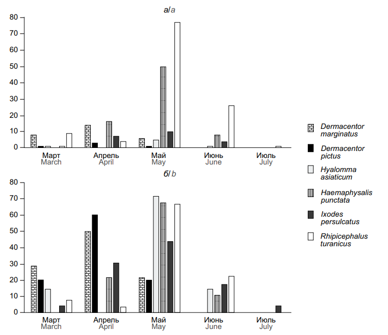 Рис. 2. Данные по клещам, снятым с людей в 2018 г. в Алматинской области. а — общее число нападений клещей разных видов на людей по месяцам; б — процентное соотношение снятых с людей клещей по видам помесячно (общее число нападений клещей одного вида принято за 100%). Fig. 2. Data on ticks collected from humans in 2018 in the Almaty region. а — the total number of attacks by ticks of different species on people by months (the abscissa shows the months, the ordinate shows the number of tick bites); b — percentage of ticks collected from humans by species per month (the total number of attacks by ticks of one species is taken as 100%) (the abscissa shows the months; the ordinate shows the percentage of ticks collected from humans by species in each month).