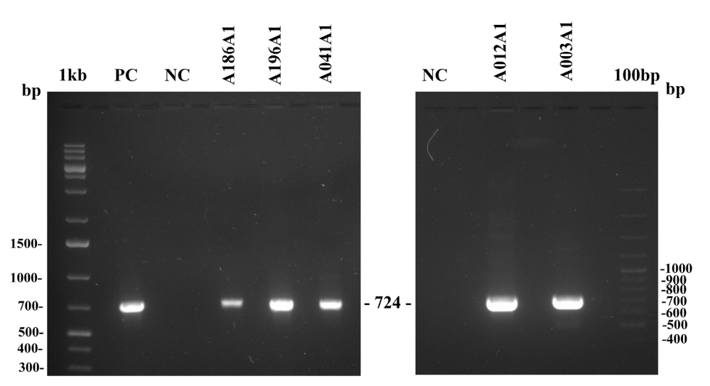 Рис. 3. Электрофоретический анализ продуктов амплификации участка гена 16S рРНК Borrelia spp. с использованием праймеров 16S1A/16S1B. 1 kb — ДНК-маркер GeneRuler 1 kb, 100 bp — ДНК-маркер GeneRuler 100 bp plus; PC — B. garinii (положительный контроль); NC — негативный контроль. A003A1, A012A1, A041A1, A186A1, A196A1 — образцы ДНК, выделенные из одиночных клещей. Fig. 3. Electrophoretic analysis of amplification products of the 16S rRNA gene region of Borrelia spp. using primers 16S1A/16S1B. 1 kb — GeneRuler 1 kb DNA ladder; 100 bp — GeneRuler 100 bp plus DNA ladder; PC — B. garinii (positive control); NC — negative control. A003A1, A012A1, A041A1, A186A1, A196A1 — DNA samples, isolated from individual ticks.