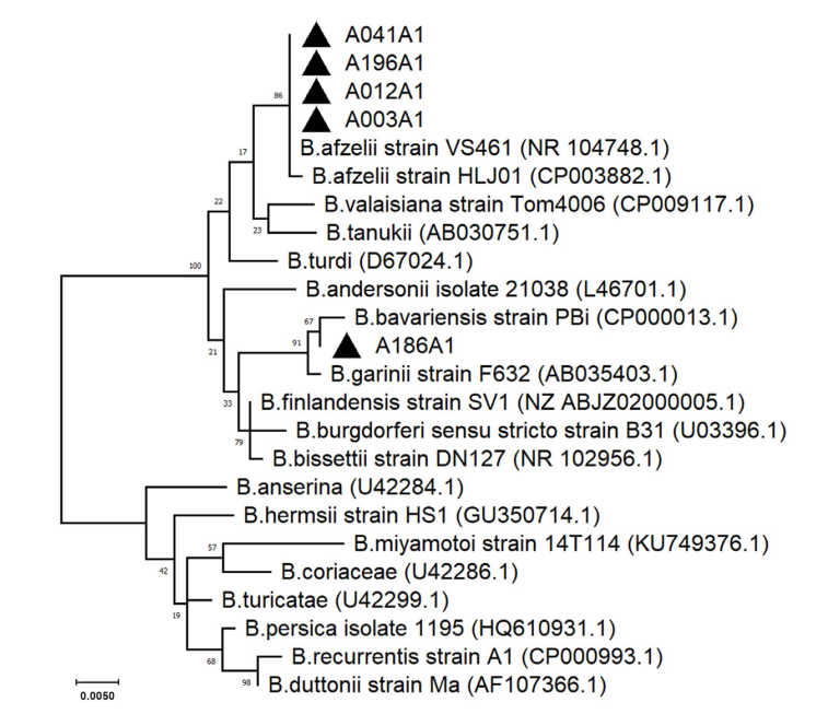 Согласно результатам проведенного филогенетического анализа, 4 образца (A003A1, A012A1, A041A1 и A196A1) были идентичны по последовательности амплификата линии VS461 (GenBank NR_104748.1) B. afzelii (рис. 4). Один образец (A186A1) содержал ДНК, наиболее близкую по последовательности амплифицированного участка гена 16S рРНК к линии PBi (GenBank NR_074854.1) B. bavariensis (2 нуклеотидные замены) и линии 20047 (GeneBank NR_043413.1) B. garinii (3 нуклеотидные замены) (рис. 4).