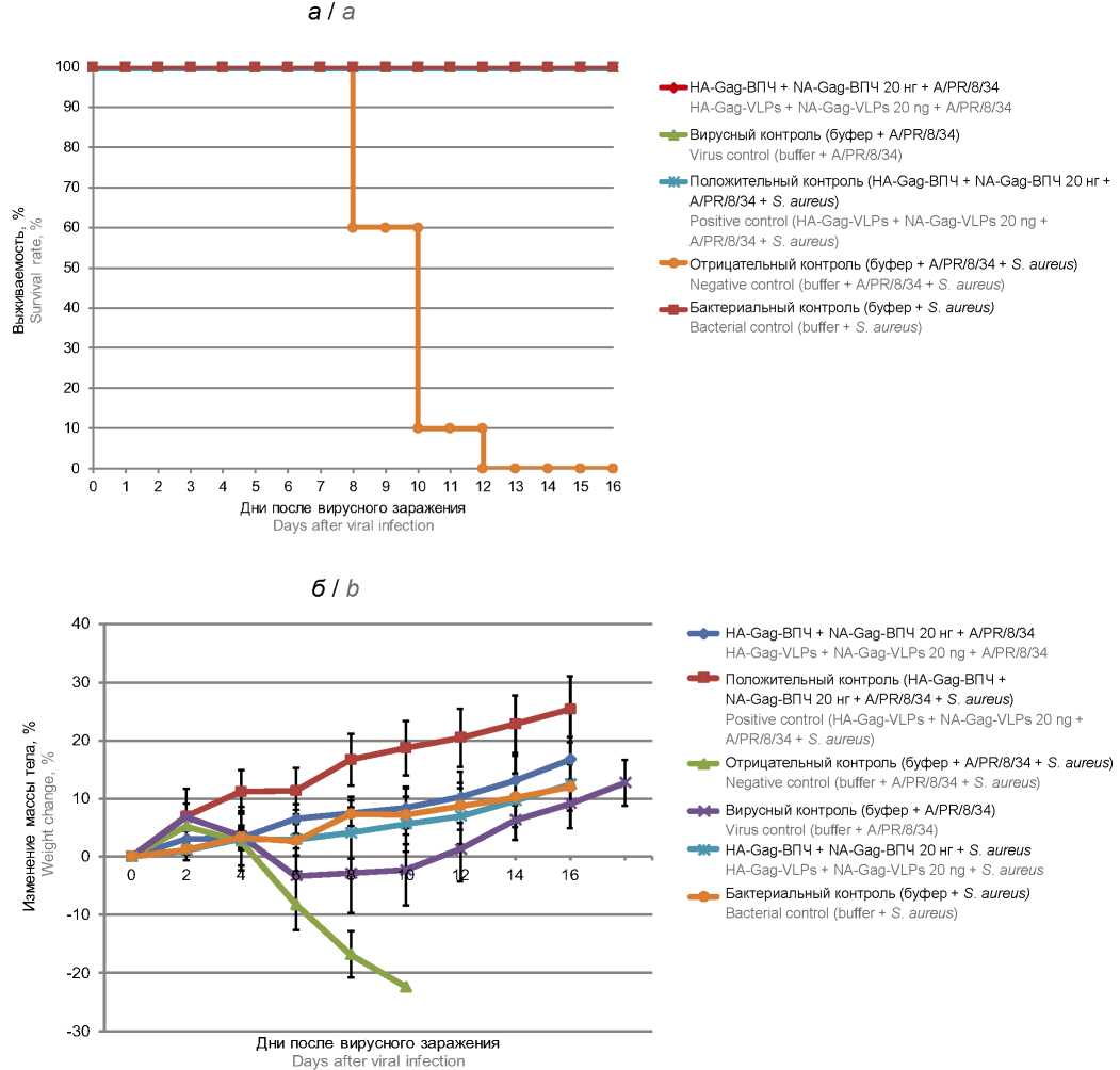 Materials and methods. We studied the effect of Gag-VLPs with the influenza HA or NA from А/PR/8/34 alone or in combination, in a lethal BALB/c mouse model of S. aureus infection after vaccine-matched or mismatched influenza virus challenge.