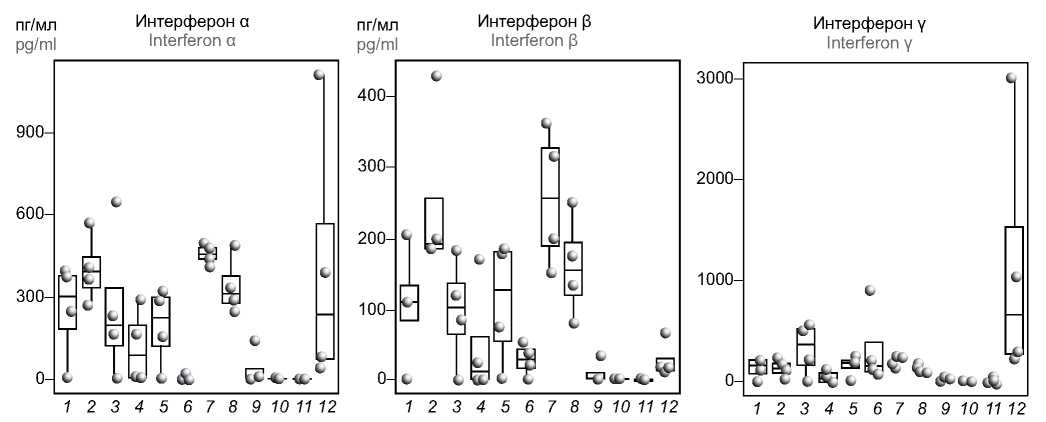 Рис. 4. Влияние вакцинации HA-Gag-ВПЧ + NA-Gag-ВПЧ в разных дозах и каждым компонентом коктейля в отдельности на индуцированную заражением вирусами гриппа экспрессию интерферонов I/II типов в легких мышей.1 — HA-Gag-ВПЧ + NA-Gag-ВПЧ 0,8 нг + NIBRG-121; 2 — HA-Gag-ВПЧ + NA-Gag-ВПЧ 4 нг + NIBRG-121; 3 — HA-Gag-ВПЧ + NA-Gag-ВПЧ 20 нг + NIBRG-121; 4 — HA-Gag-ВПЧ + NIBRG-121; 5 — NA-Gag-ВПЧ 20 нг + NIBRG-121; 6 — сублетальная доза A/PR/8/34 + NIBRG-121; 7 — Gag-ВПЧ + NIBRG-121; 8 — буфер + NIBRG-121; 9 — HA-Gag-ВПЧ + NA-Gag-ВПЧ 20 нг; 10 — HA-Gag-ВПЧ + NA-Gag-ВПЧ 20 нг + А/PR/8/34; 11 — буфер (неинфицированные мыши); 12 — буфер + А/PR/8/34. Fig. 4. The effect of vaccination with the HA-VLPs + NA-VLPs cocktail at different doses and each cocktail component separately on interferon (type I/II) expression in the lung of mice infected with influenza viruses. 1 — HA-Gag-VLPs + NA-Gag-VLPs 0.8 ng + NIBRG-121; 2 — HA-Gag-VLPs + NA-Gag-VLPs 4 ng + NIBRG-121; 3 — HA-Gag-VLPs + NA-Gag-VLPs 20 ng + NIBRG-121; 4 — HA-Gag-VLPs + NIBRG-121; 5 — NA-Gag-VLPs 20 ng + NIBRG-121; 6 — sublethtal PR8 + NIBRG-121; 7 — Gag-VLPs + NIBRG-121; 8 — Buffer + NIBRG-121; 9 — HA-Gag-VLPs + NA-VLPs 20 ng; 10 — HA-Gag-VLPs + NA-Gag-VLPs 20 ng + А/PR/8/34; 11 — Buffer (uninfected mice); 12 — Buffer + А/PR/8/34.