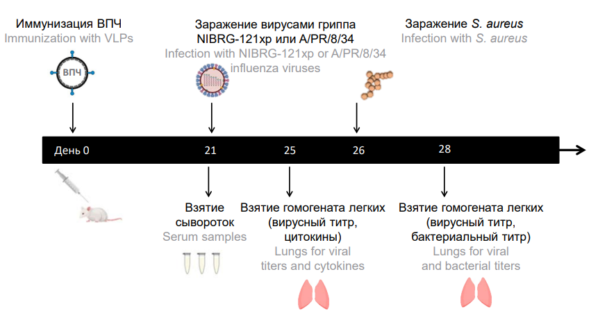 В опытах использовали ВГ, полученные из музея ФГБУ «НИИ гриппа им. А.А. Смородинцева»: А/Пуэрто-Рико/8/34 (H1N1) (далее A/PR/8/34) и реассортант NIBRG-121xp (А/Калифорния/04/2009 (pdm2009 H1N1 2009) × A/PR/8/34 (H1N1) (2 : 6)), содержащий поверхностные белки НА и NA от вируса А/Калифорния/04/2009, а внутренние белки — от A/PR/8/34. Вирусы для заражения выращивали в 9-дневных развивающихся куриных эмбрионах (РКЭ) в течение 48 ч при 37ºС. После определения инфекционной активности вирусов путем титрования в РКЭ их использовали для инфицирования животных.