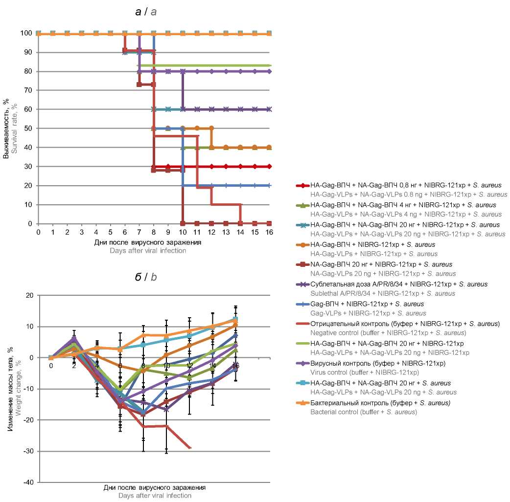 Рис. 2. Влияние вакцинации коктейлем HA-Gag-ВПЧ + NA-Gag-ВПЧ в разных дозах и каждым компонентом коктейля в отдельности на выживаемость (а) и изменение веса (б) животных на модели вторичной бактериальной пневмонии, индуцированной S. aureus, после гриппозной инфекции гетерологичным NIBRG-121xp (H1N1) ВГ.