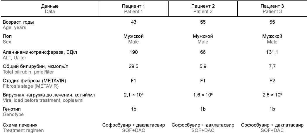 Materials and methods. The study was performed on plasma samples from 3 patients diagnosed with chronic hepatitis C virus infection and demonstrating DAA virological treatment failure. All isolates had genotype 1b. Drug resistance mutations were detected by using direct sequencing of NS3, NS5A, and NS5B genome regions. The detection technique was developed at the Pasteur Research Institute of Epidemiology and Microbiology.