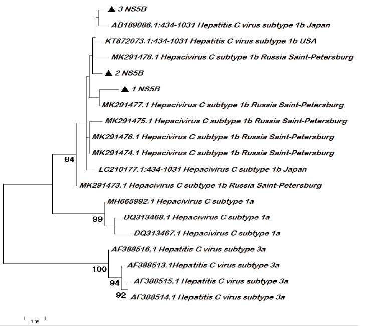 The dendogram analysis suggests that sequences of HCV NS5B gene of three genotypes cluster separately from each other. All three samples with virological failure are distributed on the neighboring tree branches belonging to HCV nucleotide sequences of genotype 1b, thus correlating with the genotypes previously identified with the help of the commercial test system.