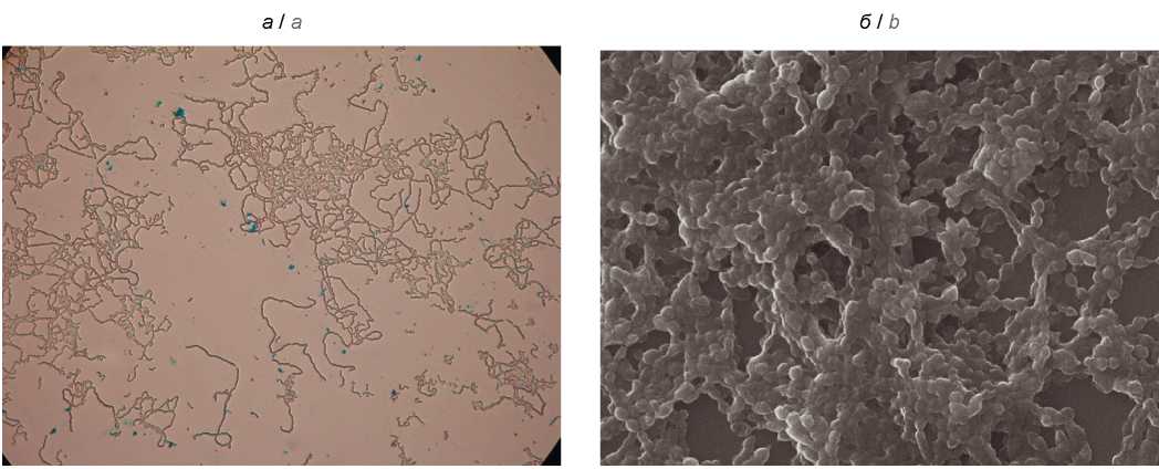 В опытах по изучению воздействия оксациллина и цефазолина на сформированную биоплёнку установлено, что малые дозы АБП (0,01, 0,05 и 0,1 мг), независимо от времени их воздействия, не нарушали целостность стрептококковых цепочек и готовой биоплёнки. В аналогичных опытах в диапазоне воздействия более высоких доз (0,5 и 1,0 мг) оба АБП также не нарушали целостность стрептококковых цепочек. Однако при этом стабильно наблюдался эффект скручивания последних в шарообразные формы, внутри которых хорошо просматривалась окрашенная биоплёнка (рис. 2). В этом диапазоне концентраций отмечено стимулирующее влияние цефазолина на сформированную биоплёнку. При световой и электронной микроскопии опытных образцов с цефазолином можно наблюдать увеличение слоя биополимерного полисахаридного матрикса зрелой биоплёнки, окружающего стрептококковые цепочки. В интервале воздействия самых высоких доз АБП (2 и 4 мг) на готовую биоплёнку наблюдался разрыв микробных цепочек на отдельные фрагменты. При этом под воздействием оксациллина отмечался не только разрыв стрептококковых цепочек, но и разрушение биоплёнки (рис. 3, а). В аналогичных опытах с цефазолином, несмотря на разрыв микробных цепочек, биоплёнка сохранялась (рис. 3, б).